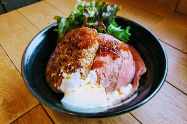 さらに、自慢のローストビーフと、120gのハンバーグがのった、よくばり丼